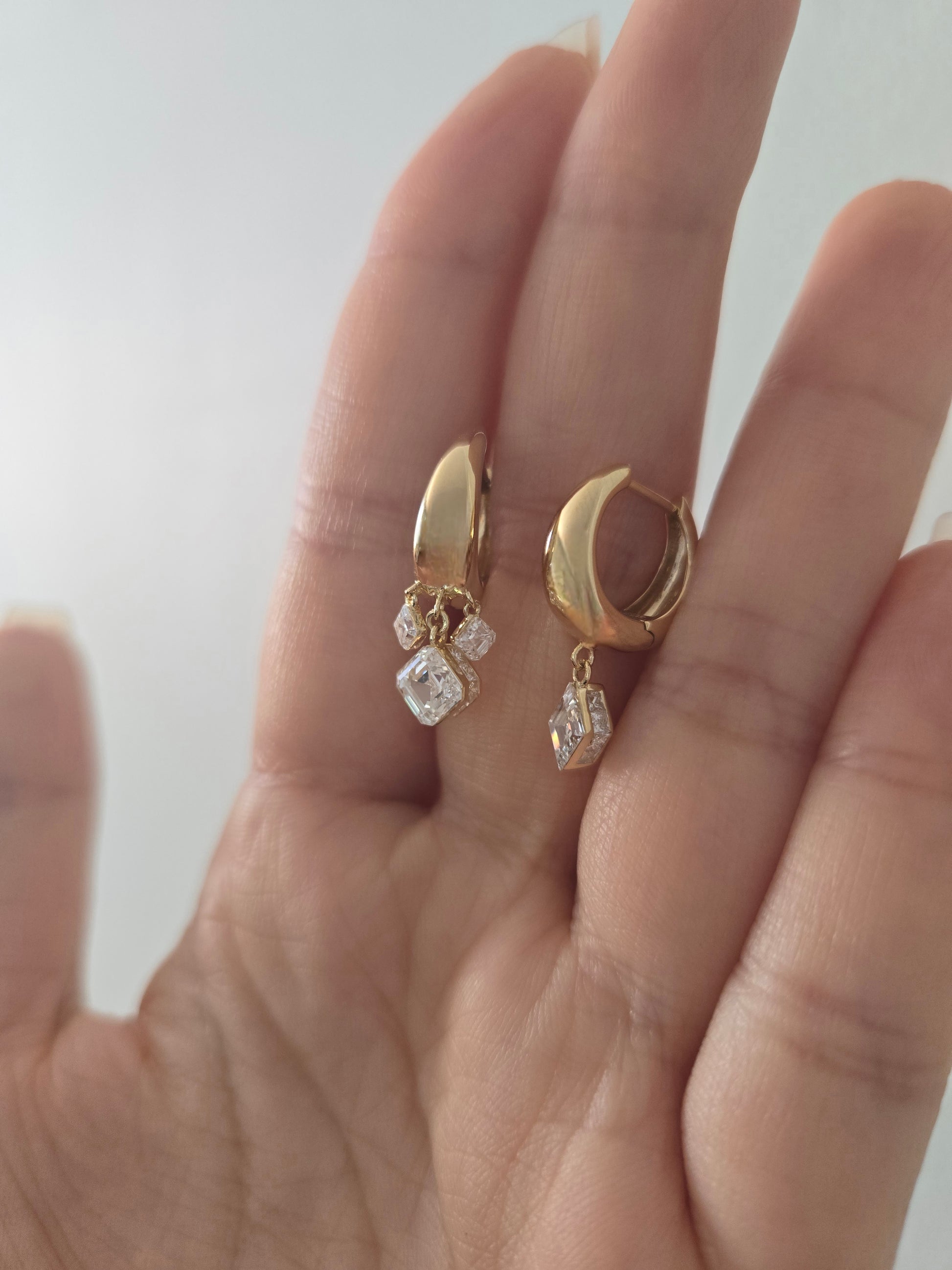 Introducing the LOZENGE LINA HOOP - SULEE's signature tapered hoop features a suspended lozenge diamond, floating within an open-back seamless setting that borders princess cuts for a luminous, refined finish.